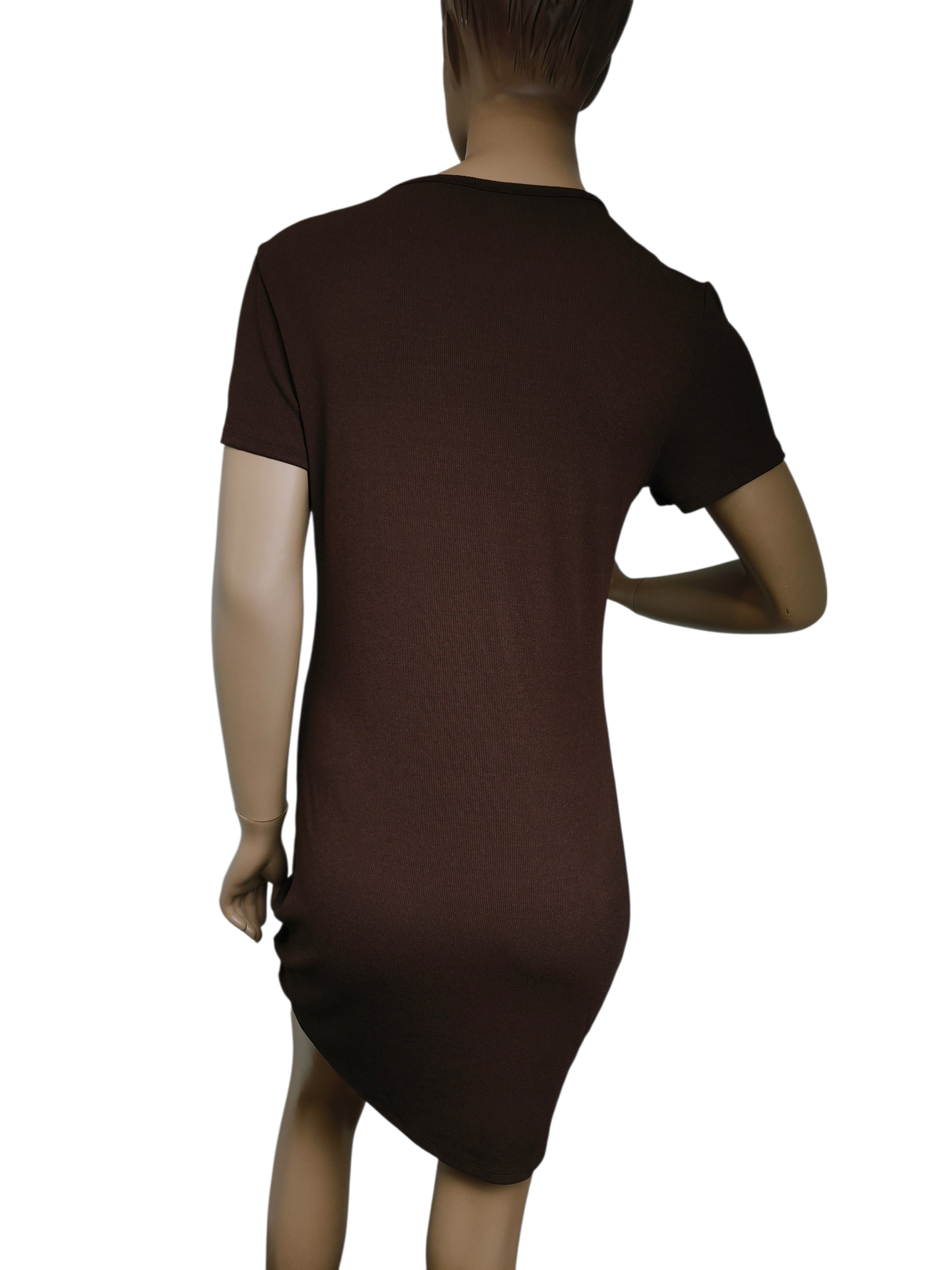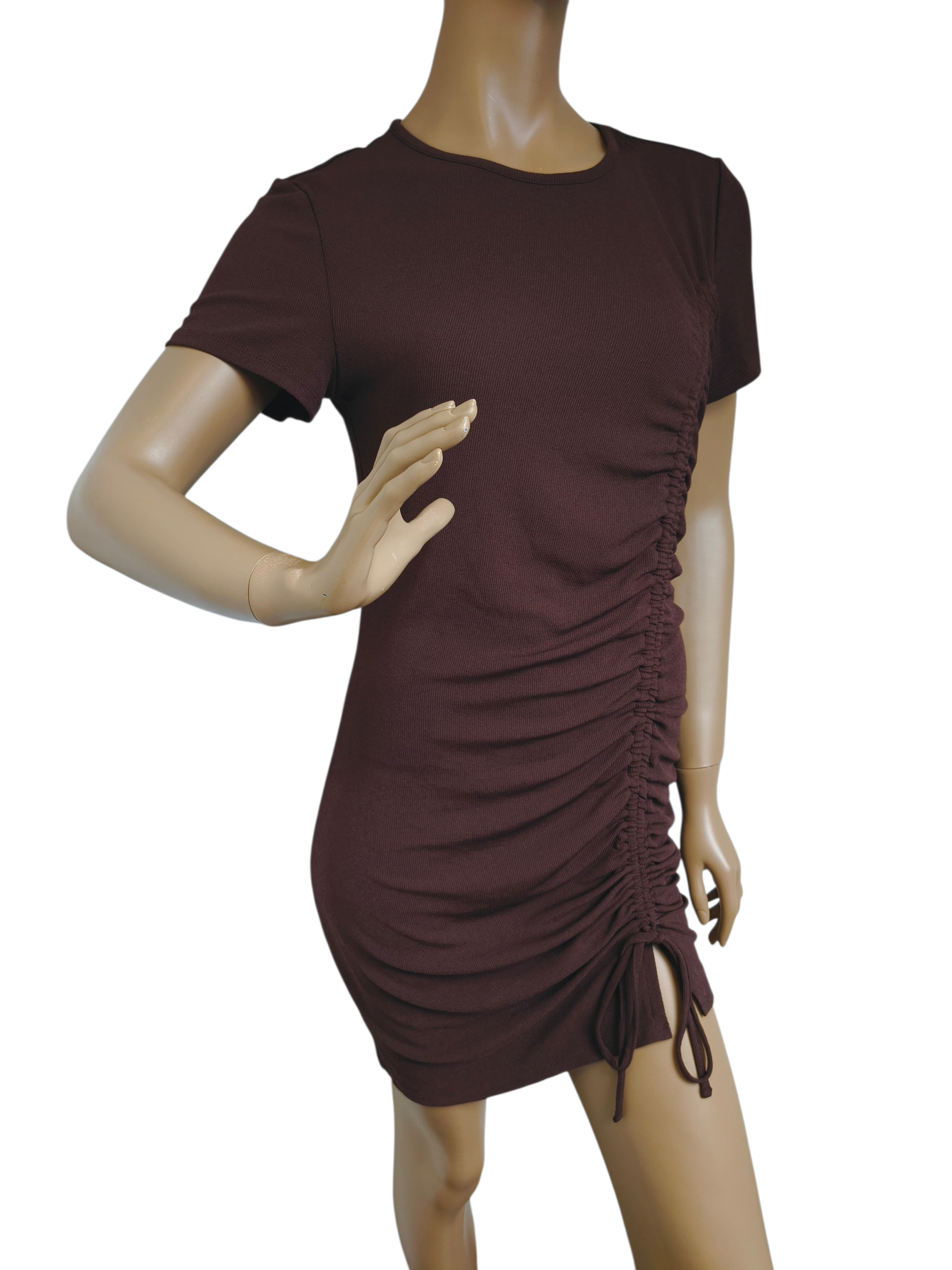 Ta brązowa, dopasowana sukienka z charakterystycznym marszczeniem i troczkiem z boku to model marki H&M (linia Divided). Jest to sukienka typu bodycon o długości mini, wykonana z prążkowanego dżerseju z krótkimi rękawami. Regulowany troczek pozwala na dopasowanie stopnia marszczenia oraz długości sukienki po jednej stronie.